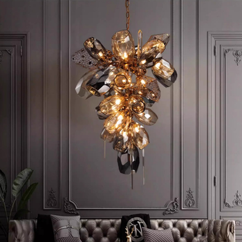 ثريا زجاجية كريستالية طويلة بتصميم فريد من نوعه خفيفة وفاخرة على شكل غير منتظم لسقف مرتفع لغرفة الطعام في الفيلا باللون الذهبي
